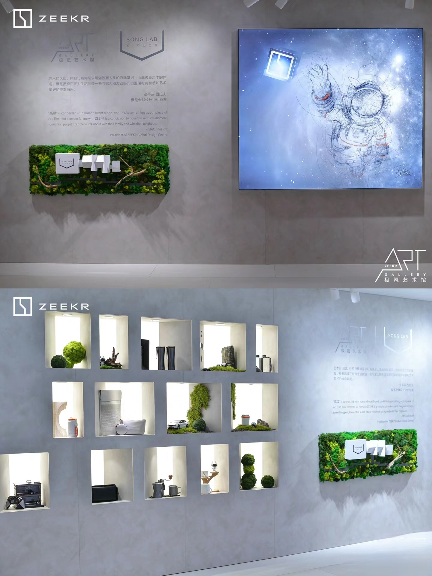 跨界合作藝術館式展臺:極氪展臺與松美術館共同設計,延續了“藝術館”的風格,將科技與藝術完美融合,共同打造出一個充滿藝術氣息的科技空間。這種跨界合作不僅提升了展臺的藝術價值,還拓寬了品牌的文化內涵,為觀眾帶來獨特的視覺享受和沉浸式體驗。這種設計不僅展現了極氪品牌的先鋒創新之美,還通過藝術手段增強了品牌與用戶的互動和共鳴。