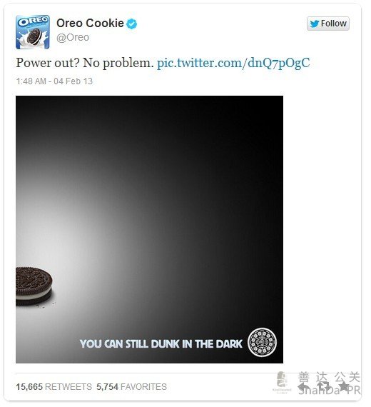 這則應景的消息贏得了大量的分享和好評,在沒有占用奧利奧任何預算投入的條件下,成功上演“屌絲的逆襲”,占據了社會化媒體版塊里的用戶“頭條”,成為Twitter的營銷教科書里又一起典型案例。