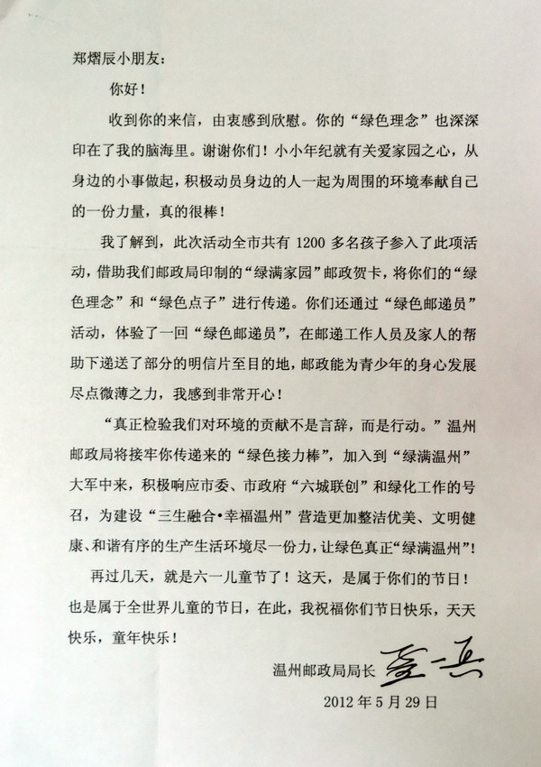 在“綠滿家園”賀卡寄出不久后,隊長學校紛紛收到了領導回信,對孩子們在少年兒童小小年級就能夠樹立建設綠色校園的理念,并努力參與綠色校園建設活動,感到由衷的欣慰和感動。其中市環保局局長鄭建海在給隊長學校王點同學的回信中希望大家都能擁有一個健康快樂的“綠色童年”,能繼續做綠色小達人,描繪心中美麗的綠色地圖。市郵政局局長孟一兵在給鄭熠辰同學的回信中提到溫州郵政局將接牢你傳遞來的“綠色接力棒”,加入到“綠滿溫州”大軍中來,為營造更加整潔優美、文明健康、和諧有序的生產生活環境盡一份力,讓綠色真正“綠滿溫州”。