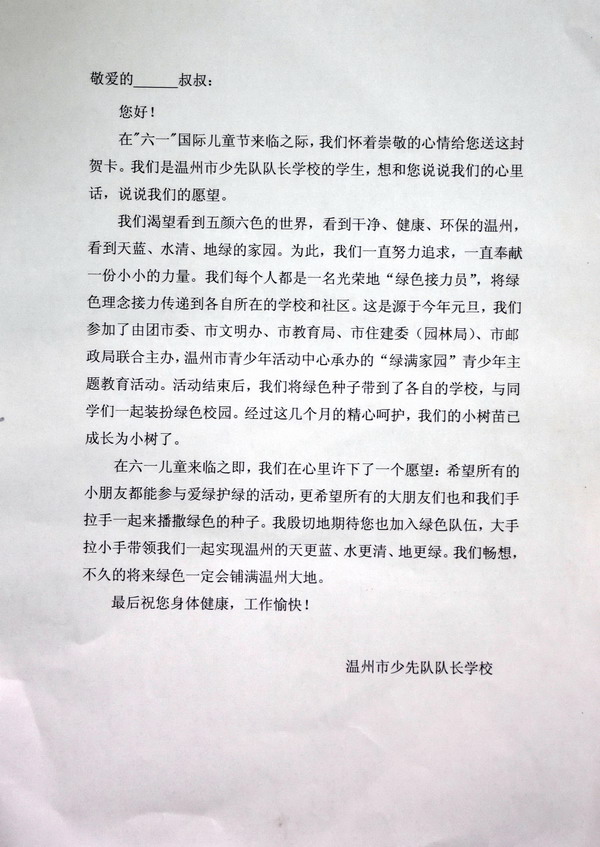 為讓綠色理念傳遞到全市各個角落,讓每個人光榮地成為“綠色接力員”,共建“綠滿家園”,在“六•一”國際兒童節來臨之時,溫州市第三屆少先隊隊長學校學員代表向全市30余名市級領導寄送“綠滿家園”賀卡,畫上“綠色”金點子或理念,并說出自己的六一心愿,希望所有的小朋友都能參與愛綠護綠的活動,更希望所有的大朋友們也和少年兒童手拉手一起來播撒綠色的種子,一起實現溫州的天更藍、水更清、地更綠的心愿。