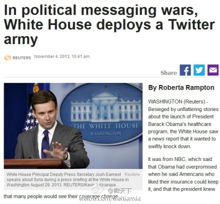 推特成為白宮重要公關手段】美國政府對于新媒體的應用走在了世界的前列。在美國總統奧巴馬推出醫改方案的過程中,推特成了白宮最重要的公關手段,,一旦有重要信息推出,白宮就會利用推特官號及廣大白宮職員的個人賬戶在網絡對政策予以說明、與對手唇槍舌戰,并與網友互動。(美國廣播公司)