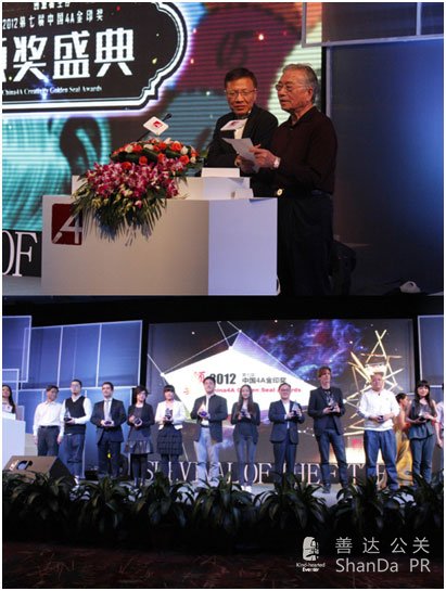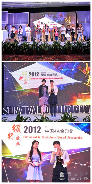 10月13日,以“創(chuàng)意者生存”為主題的2012年中國4A創(chuàng)意金印獎(jiǎng)?lì)C獎(jiǎng)之夜在杭州落幕。在前期入圍的262件作品中,組委會評選出全場大獎(jiǎng)2件,金獎(jiǎng)9件,銀獎(jiǎng)37件,銅獎(jiǎng)80件,一如既往的保持著少而精的原則。其中靈思營銷《重慶,回來了》獲得網(wǎng)絡(luò)互動病毒式營銷類金獎(jiǎng),《重慶,回來—媽媽篇》和《看不見的真相》獲網(wǎng)絡(luò)互動病毒式營銷類銅獎(jiǎng),(文章來自活動策劃公司、上海公關(guān)公司),《餐中有鬼》《美杜莎篇》《線控兒童》三部作品獲得平面類入圍獎(jiǎng),此外,靈思營銷還獲得“中國4A突出貢獻(xiàn)獎(jiǎng)”。