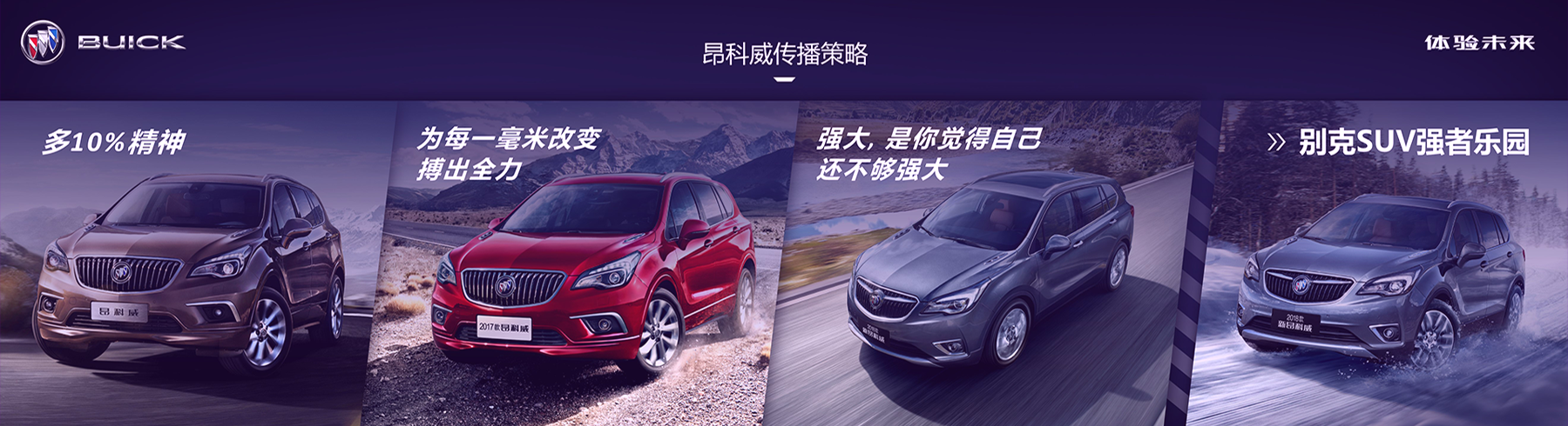 基于BUICK在汽車行業內是以簡潔、大氣、安全的品牌調性,在本次設計風格上采用了科技互聯的設計風,并且采用了大量的對比策略讓BUICK多了10%的精神,讓新的一代車型變得更加強大,在文字策略上采用了“不同凡想”傳播策略,很大程度上提高產品的客戶體驗。